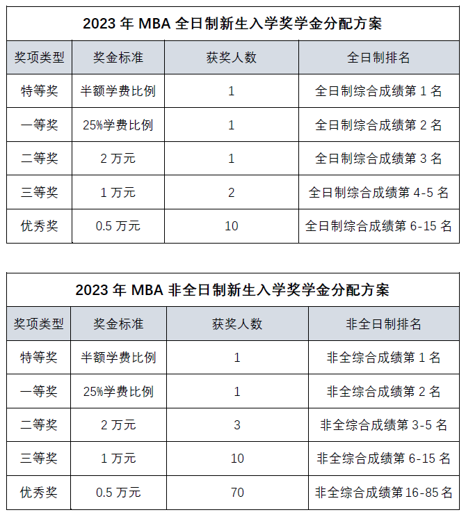 二、2023级MBA新生注册报到后,开始发放奖学金,依据MBA考生入学综合成绩排名(全日制、非全日制分类排名),自上而下取足获奖名额为止;当成绩相同时,取面试成绩高者。